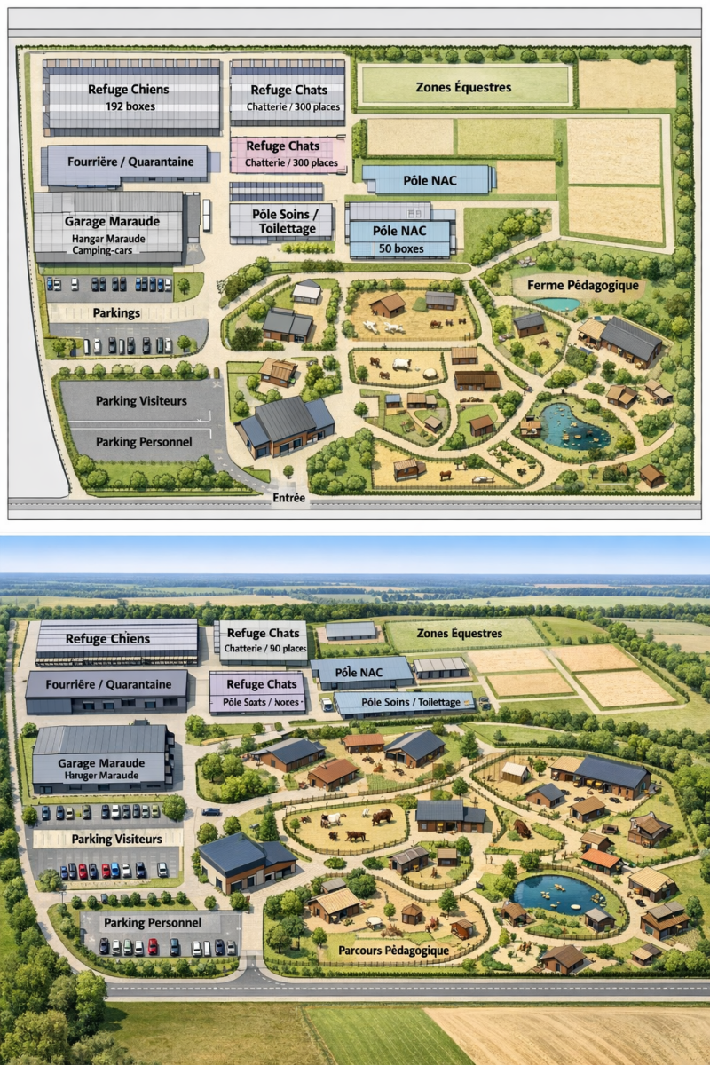 Chiens : 192 boxes × 2 chiens, zones jour & nuit, parcs détente