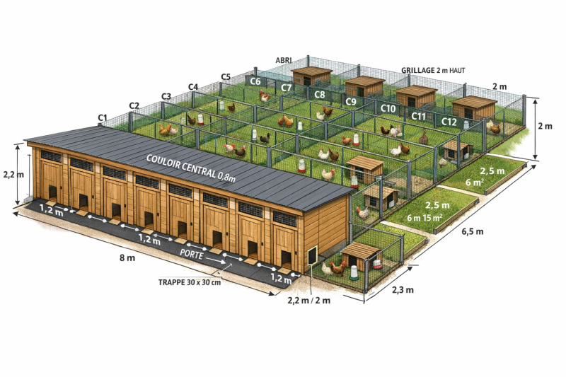 Poulaillers, volières, mare à canards